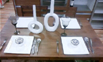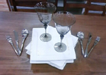 白い食器とワイングラスとカトラリー。