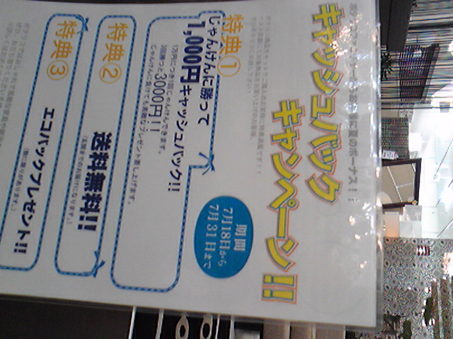 お買上げ1万円につき、スタッフと1回じゃんけんをして頂き、お客様が勝ちますと1000円分の商品券をキャッシュバック!なので、お買上げ金額が3万円だと、チャンスは3回♪夢が膨らみますね!じゃんけんに負けてもプレゼントをご用意致しております。・・・僕はさっそく負けてしまいました(笑)