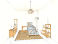 このパースにスタッフ同士で雑貨やラグなどを入れ込んでひとつのコーナーを作っていきます。ちなみに描かれている商品は現在ポタリコに展示している商品なんですよ。ディスプレイひとつでこんなにお部屋の雰囲気って変わるものなんですね。