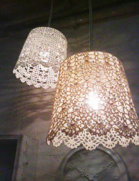 樹脂を染込ませて成形することで、通常シェードに使わないコットンレースをランプシェードとして用いたかわいい照明。