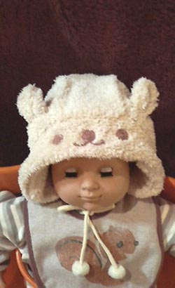 ボンボン付きのひもを、赤ちゃんのあごの下で結んで。